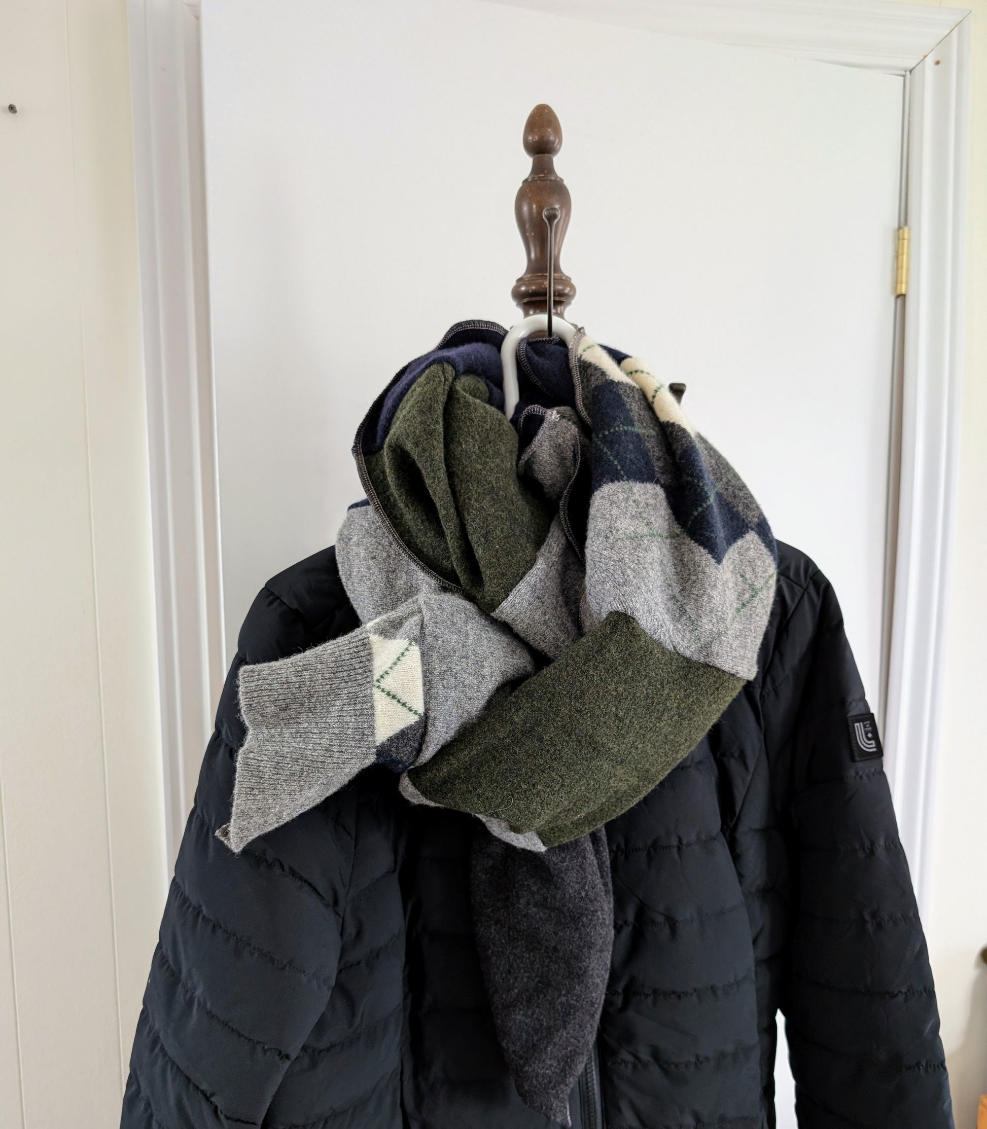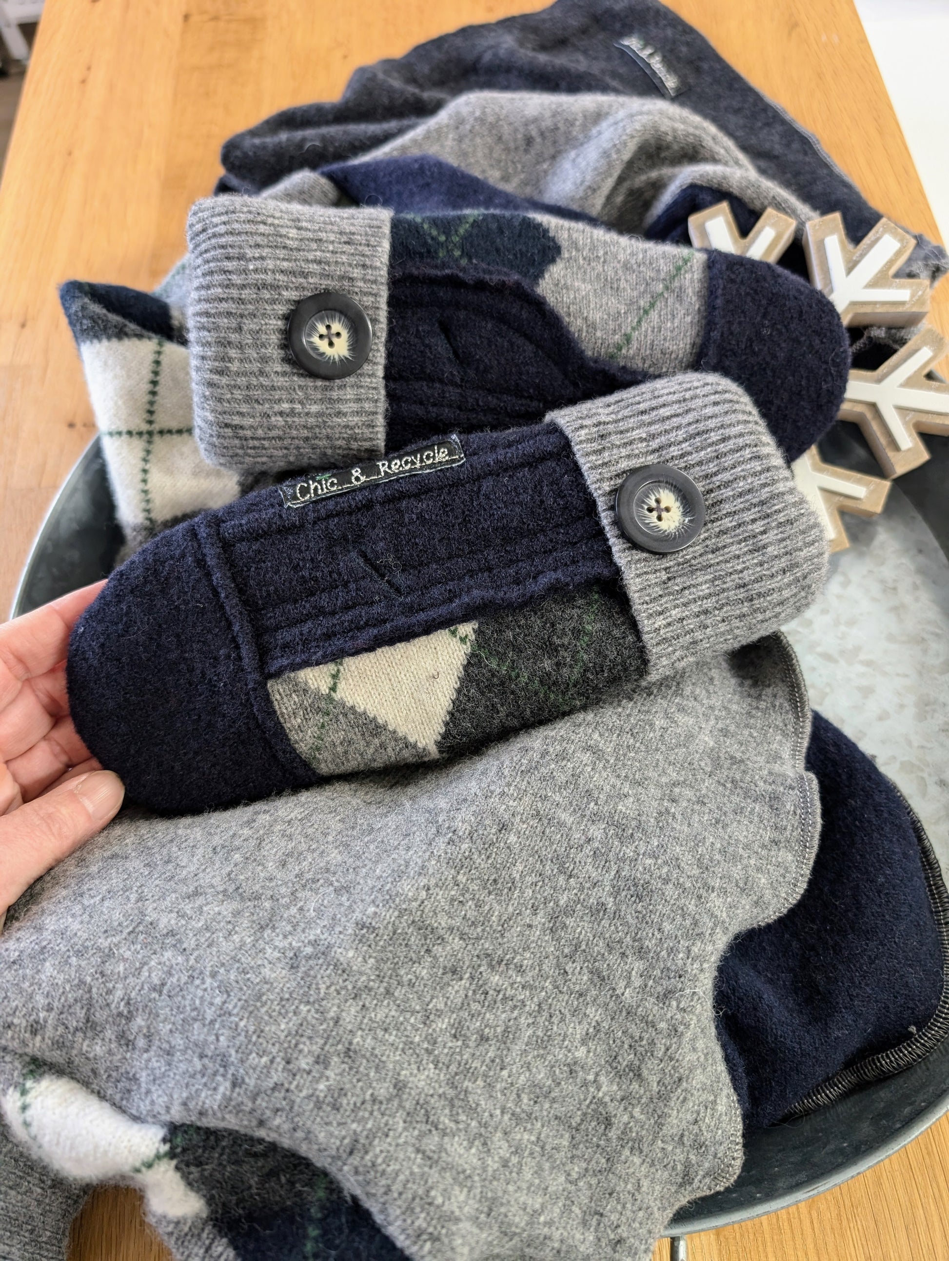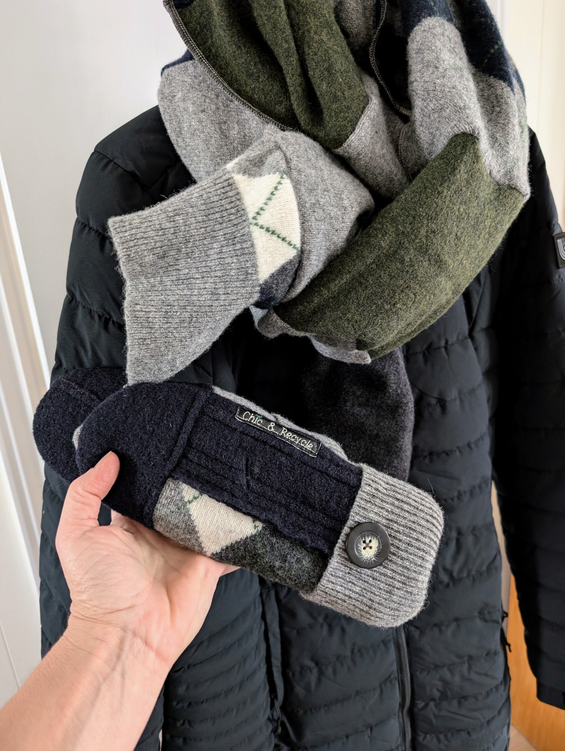 Vous serez au chaud et aurez fière allure avec cet ensemble. Laines en deuxième vie pour aider notre petite planète. Des tons de marine et de vert avec du gris. Bon plan n'est ce pas? Foulard bien long et confortable
