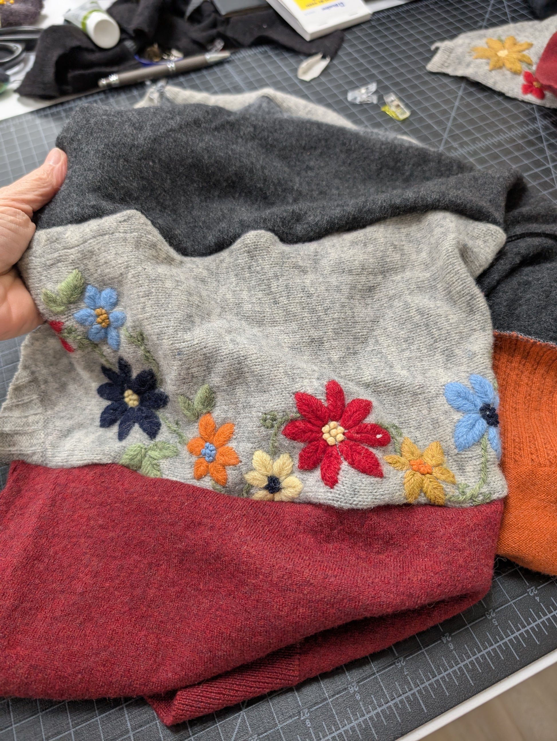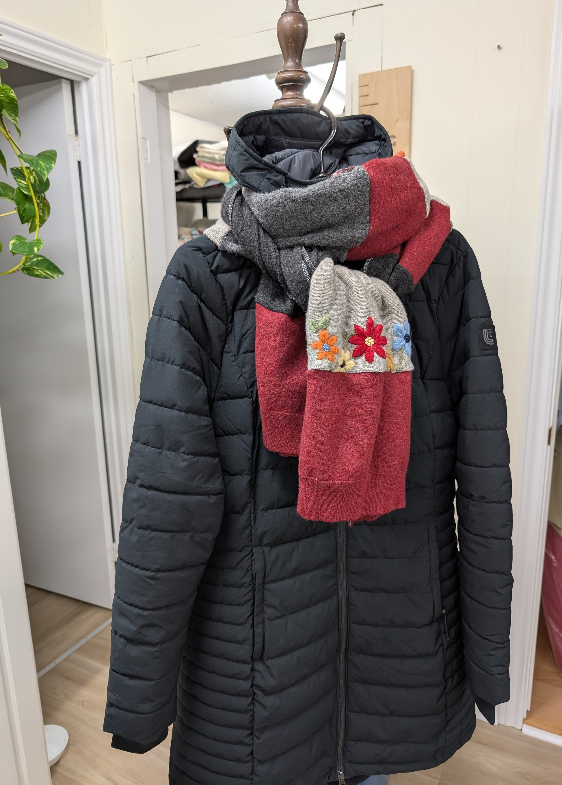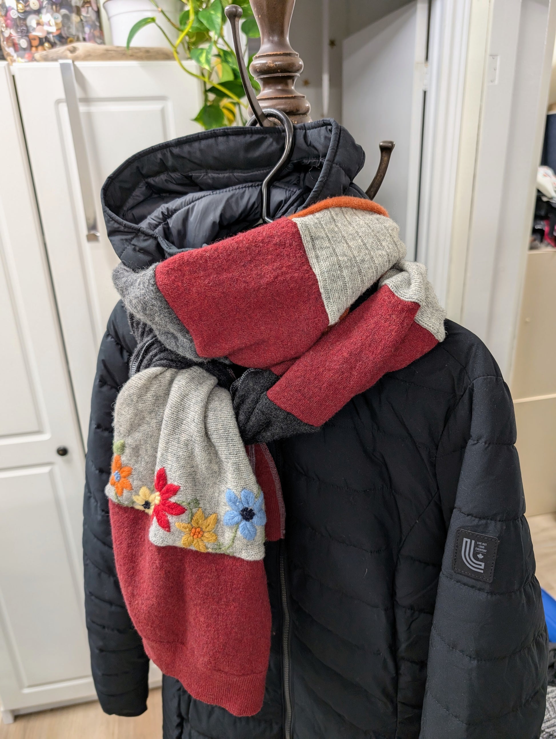 Vous voyez bien! Des fleurs en laines. Un grand foulard bien joyeux et doux.