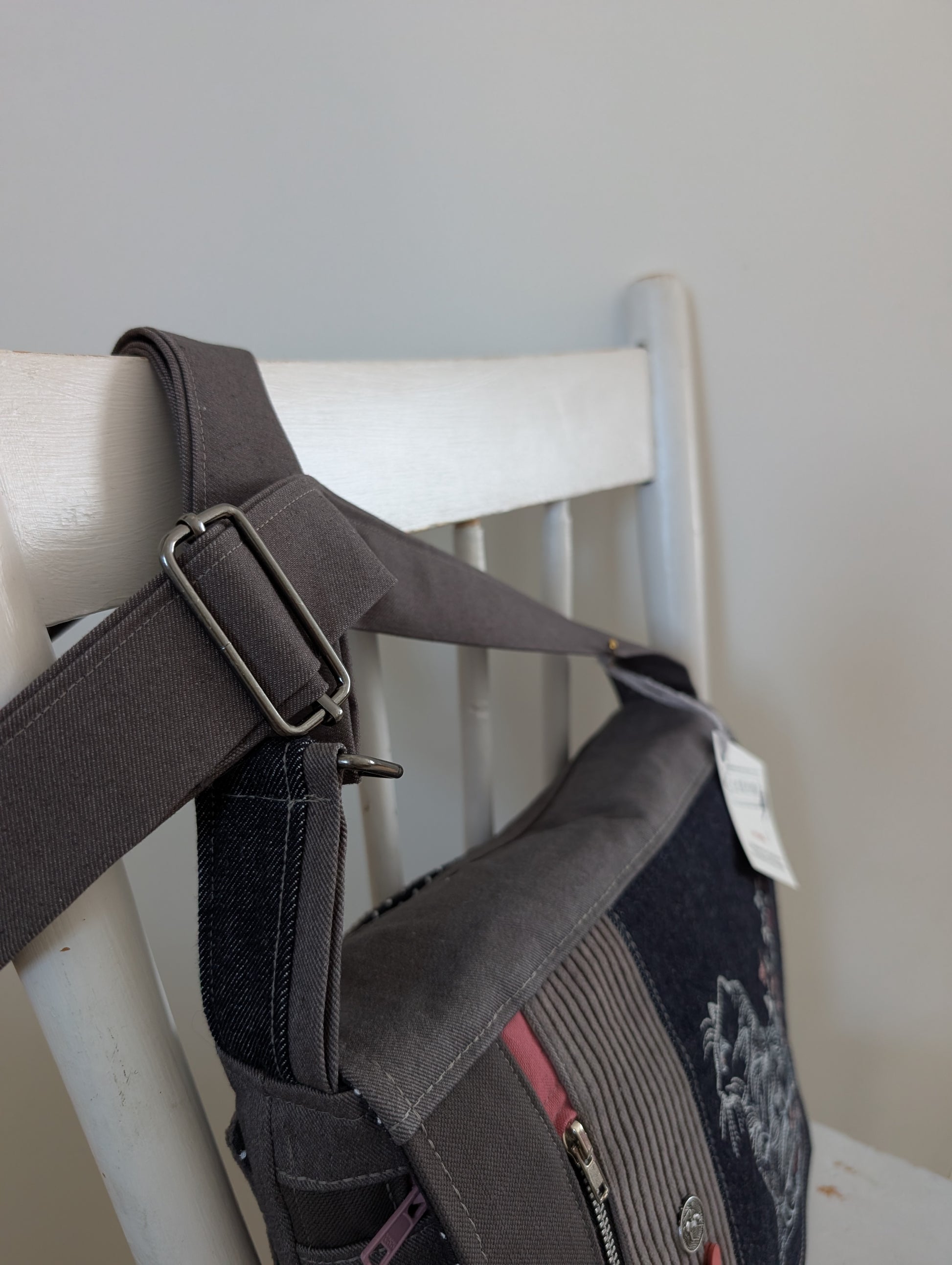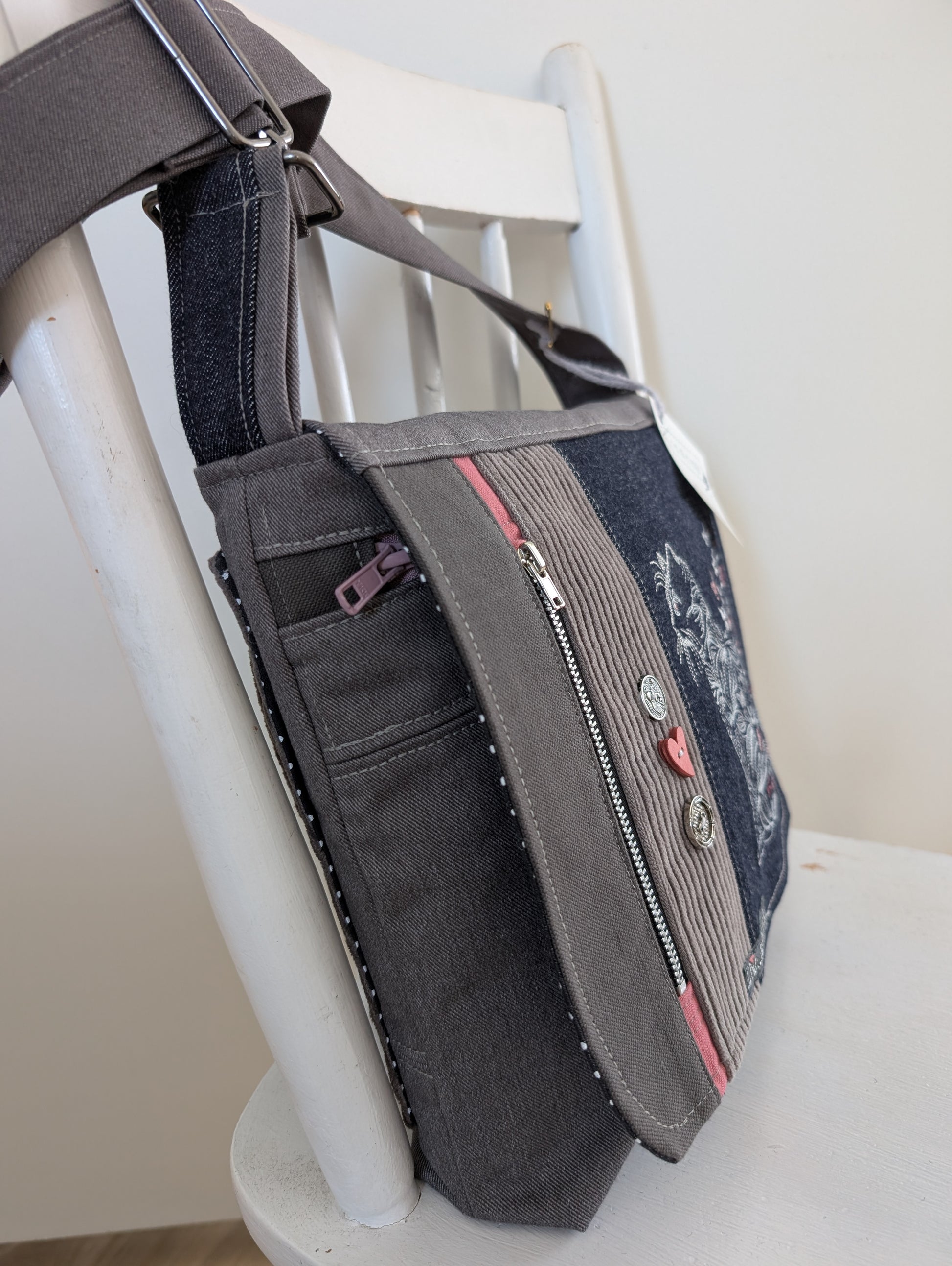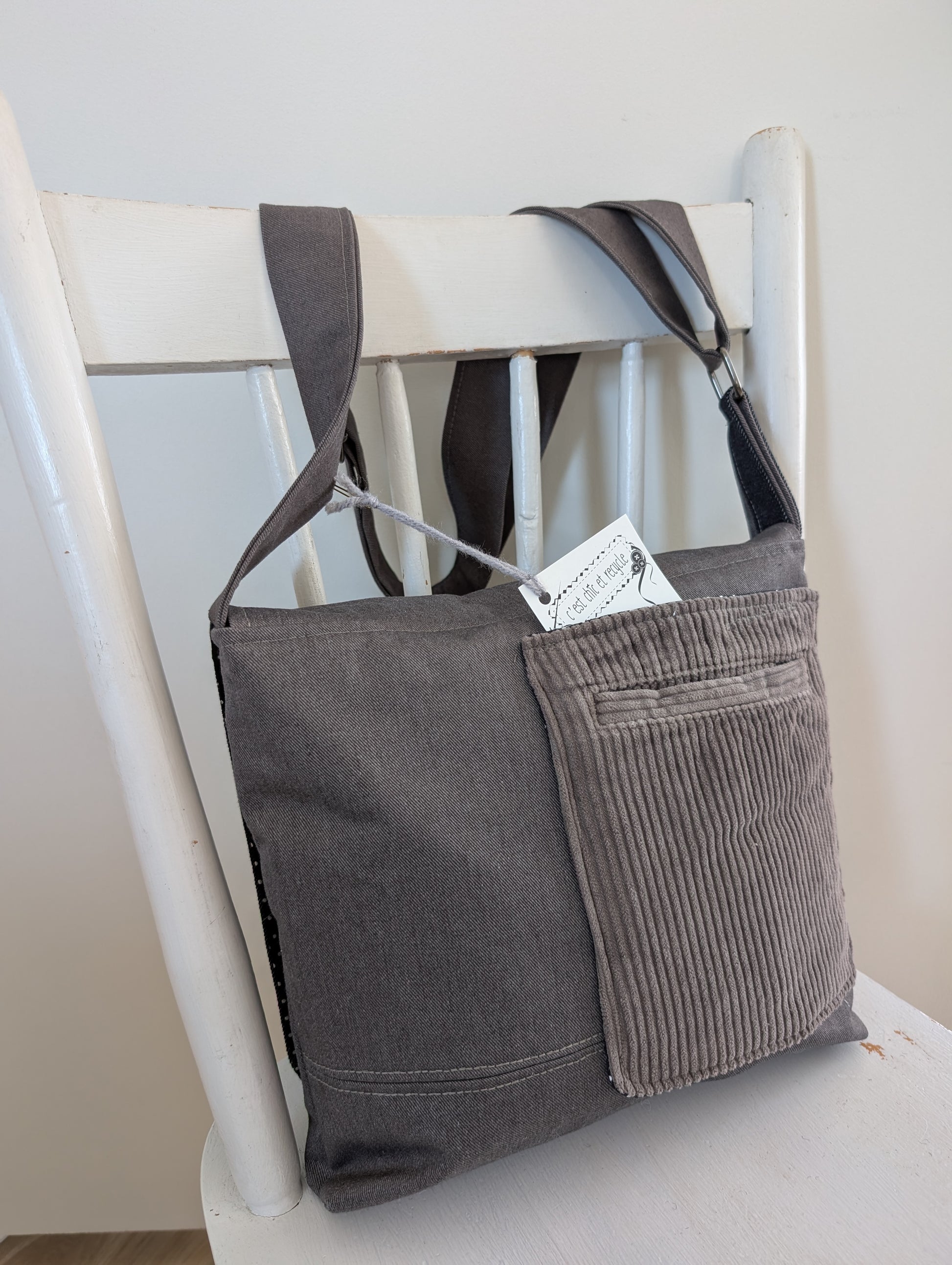 Il est de format régulier donc environ 11" par 11" . Des fermetures éclairs au nombre de trois et une double poche rapide au dos.