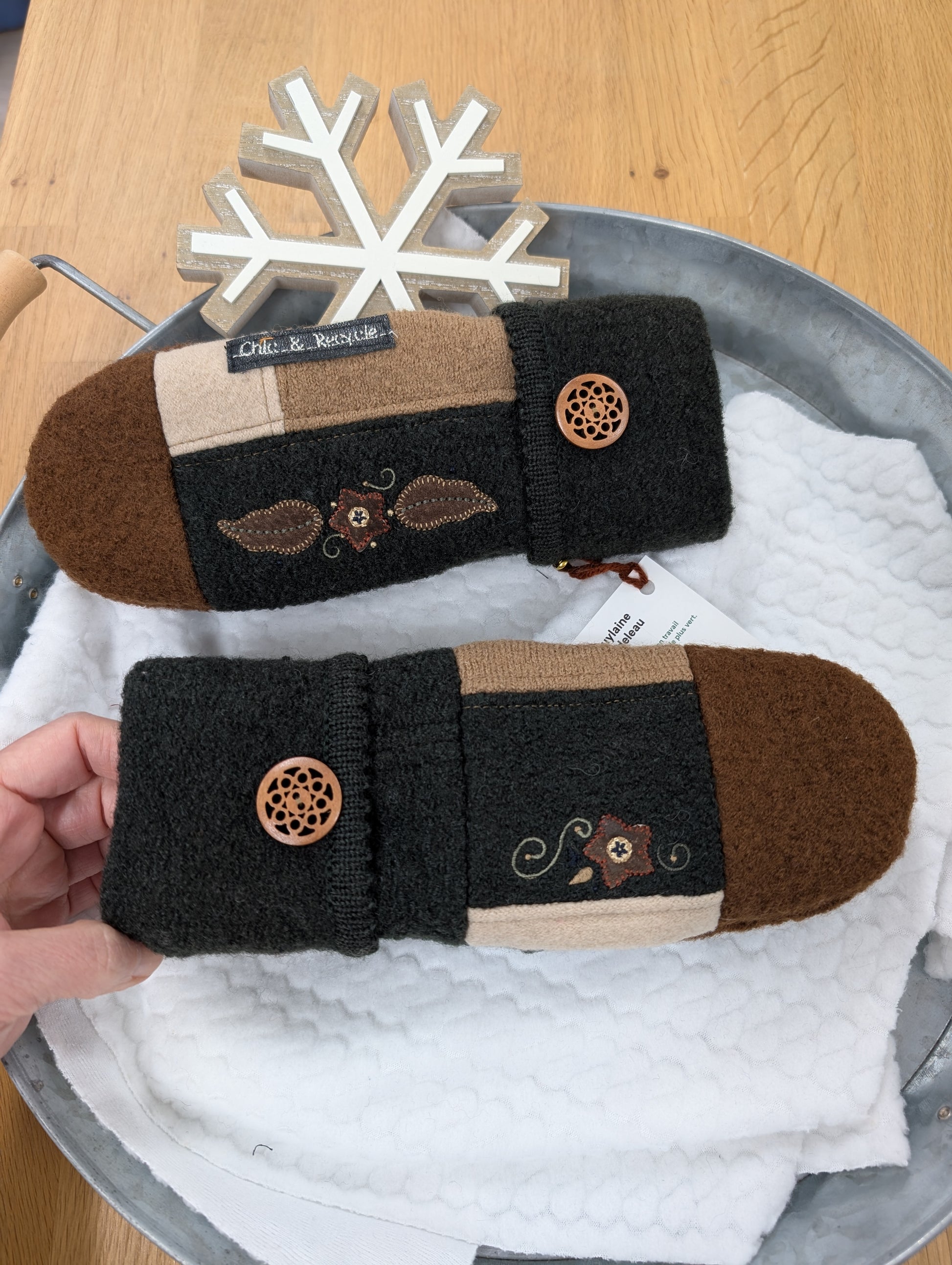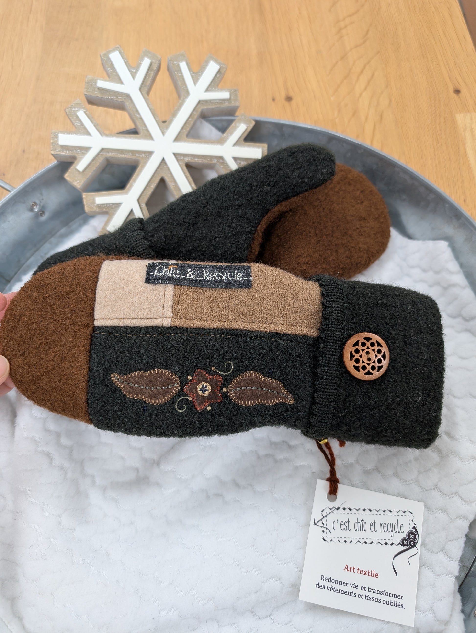 Mitaines au couleurs de la foret. Vert foret et beige un peu de brun. Elles sentent presque le sapin hihihi.