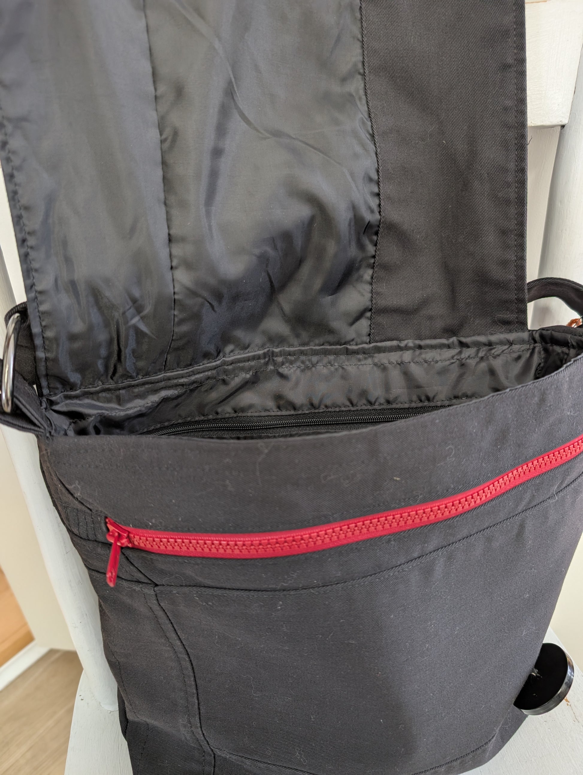 Même si je suis noir la touche de rouge me rend quand même joli. Belle grande bandoulière ajustable et bien sur, mes trois boutons signature!